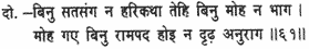 Except in the company of saints, one does not hear the story of Hari, and not till that be heard will delusion take to flight; and till delusion is dispelled, one cannot have unwavering affection for Rama’s feet.