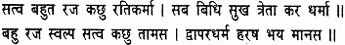 Abundance of the element of Goodness, with a slight admixture of Passion and an attachment to action, together with a general sense of happiness, are the characteristics of the Tretayuga. Much Passion, very little Goodness, and some Ignorance, together with a feeling of mingled joy and terror in the heart, are the distinguishing marks of the Dvaparayuga.