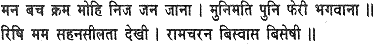 When he perceived that I was his own devoted servant in thought and word and deed, the Blessed Lord restored the sage to his senses again. On beholding my forbearance and perfect confidence in Rama’s feet.