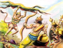 When Hanuman could not be apprehended, Ravana asked his younger son Akshaya to do the needful. Akshaya climbed his chariot and reached the scene of fight between Hanuman and the demons. He was fully armed and protected by his army. Hanuman wanted to make clear to Ravana what Rama's devotee could do and what strength or power he possessed. When Akshaya attacked, Hanuman retaliated. Akshaya's chariot was destroyed and his charioteer was killed. Akshaya drew his sword and made an assault on Hanuman. Hanuman jumped up in the sky. Akshaya tried to jump and tried to brandish his sword. In turn, Hanuman caught hold of his leg and revolved him in the air. Akshaya fell dead on the ground.