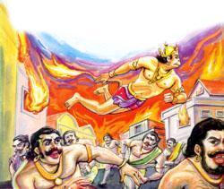 Saying so, he rode his chariot and rushed to capture Hanuman. Meghanad attacked fiercely by showering arrows. Hanuman was injured and blood began to flow out. This annoyed him. He pulled up a very huge iron pillar from the ground and threw towards Meghanad. Meghanad saved his life by jumping out of his chariot. But his chariot and a number of accompanying soldiers were smashed.