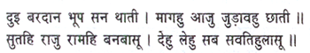 There are two boons that the king once promised you. Ask for them today and relieve your soul – sovereignty for your son and for Rama exile to the forest; thus shall you rob your rivals of all their joy.
