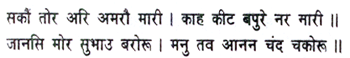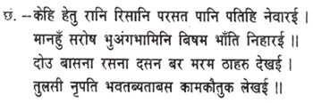 As the king touched her with his hand, saying, ‘Why are you so angry, my queen?’ Kaikeyi threw it aside and flashed upon him a furious glance like an enraged serpent, with her two whishes for its tongues and the boons for its fangs, looking for a vital spot. As fate would have it, says Tulasi, the king took it all as the playfulness of love.