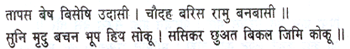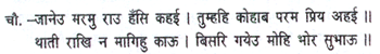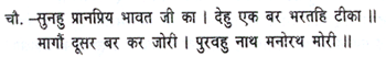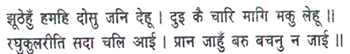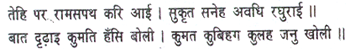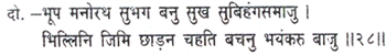 Moreover, I have unwittingly sworn by Rama, the lord of Raghus, who is the very perfection of virtue and the highest embodiment of affection.’ Having thus firmly bound him to his word, the evil-minded queen smiled and said, revealing her wicked scheme and loosing as it were the bandage from the eyes of a cruel hawk.