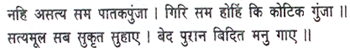 Even a multitude of sins cannot equal a lie. Can millions of tiny Gunja seeds make a mountain? Truth is the root of all noble virtues, as the Vedas and the Puranas declare and as Manu (the first law-giver of the world, the author of Manusmriti) has expounded.