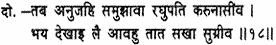 Only enlightened sages who have a hearty devotion to the feet of Raghunatha can comprehend the mystery of these actions of his. When Lakshmana found the Lord angry, he strung his bow and grasped his arrows.