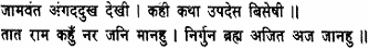 Seeing Angad's distress. Jambhavan (the old bear chief) recounted many as instructive tale: 'Imagine not Rama to be an earthling, dear friend; know him to be the same as Brahma (the Supreme Spirit), without attributes, invincible, unborn.