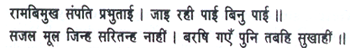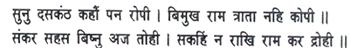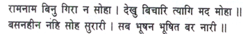 Speech is charmless without the name of Rama; ponder and see for yourself, casting aside arrogance an infatuation. Without her clothes, O enemy of gods, a lovely woman decked with all adornments is a shameful sight.