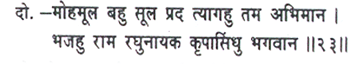 Abandon pride, a sin born of tamas(darkness) and infatuation, a source of many woes, and adore Rama, chief of the house of Raghu, ocean of grace, the Blessed Lord!’
