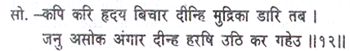 Then Hanuman pondered awhile and dropped down the signet ring, as though the ashoka tree had thrown a spark (in response to her prayer). Joyfully she arose and took it in her hand.
