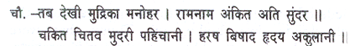 Now she looked at the lovely ring with the name of Rama most beautifully engraved on it. Recognizing the ring, she looked at it in amazement and was agitated at heart wit mingled joy and sorrow.