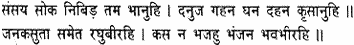 A sun to scatter the thick darkness of doubt and grief, and a fire to burn up the dense forest of the demon race. Why not worship Janaki and Raghubira, who dispels the fear of rebirth.