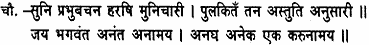 All his three brothers then prostrated themselves along with Hanuman and were greatly delighted. The sages, as they gazed on Raghunatha’s peerless beauty, were beside themselves with rapture; they had drunk the cup of ecstasy.