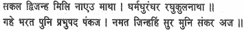 The lord of the houses of Raghu, the champion of righteousness, greeted all the Brahmans and bowed his head before them. Then Bharata clasped the Lord’s lotus feet, ever worshipped by gods and sages, Shiva and Brahma.