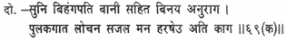 On hearing Garuda’s speech so modest and affectionate, Kakabhushundi felt a thrill of joy, the hair of his body bristled with delight and tears rushed to his eyes.