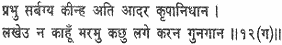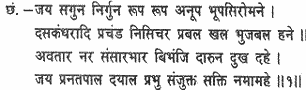 ‘O you’ who are personal and impersonal, incomparable in beauty, crest-jewel of kings, you have slain by the might of your arm Ravana and all the other dread demons, monsters of iniquity! Appearing in human garb, you rid the world of its burdens and put an end to its tormenting woes. Hail, merciful Lord, protector of the suppliant! You, omnipotent Lord, and your consort, Sita, we adore!