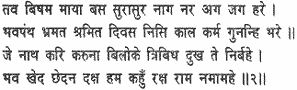 ‘Subject to your relentless illusion, O Hari, gods and demons, serpents and men and all creation, animate and inanimate, wearily wander night and day on the unending path of birth and death, impelled by fate and karma (destiny) and the gunas (modes of material nature); but they whom you regards, O Lord, with compassion have been rid of the threefold affliction. Protect us, Rama, prompt as you are in putting an end to the weariness of mortality, we adore you!