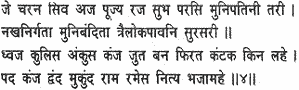‘O Mukunda, Rama, Lakshmi’s lord, we ever adore your lotus feet, which Shiva and Brahma worship, the touch of whose blessed dust redeemed the sage’s wife (Ahalya), from whose nails sprang forth the heavenly stream (Ganga), reverenced by sages and purifying all the three spheres, and the soles of which, while bearing the marks of a flag, thunderbolt, goad and lotus, are further adorned by scars left by the thorns that pierced them in the course of your wanderings in the woods.
